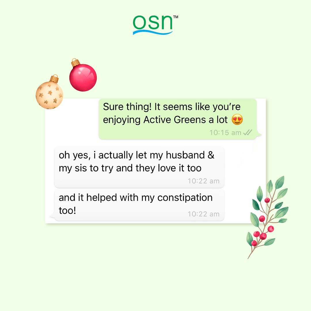 People nowadays build up a great deal of acidity in their bodies through eating too much meat, sweets, and junk foods. That acidity leads to a wide variety of symptoms, including cardiovascular diseases and stomach discomforts. These can easily be overcome by taking OSN Active Greens which has an alkalinising effect on the body’s system, causing your pain to disappear as soon as the acidity neutralises.